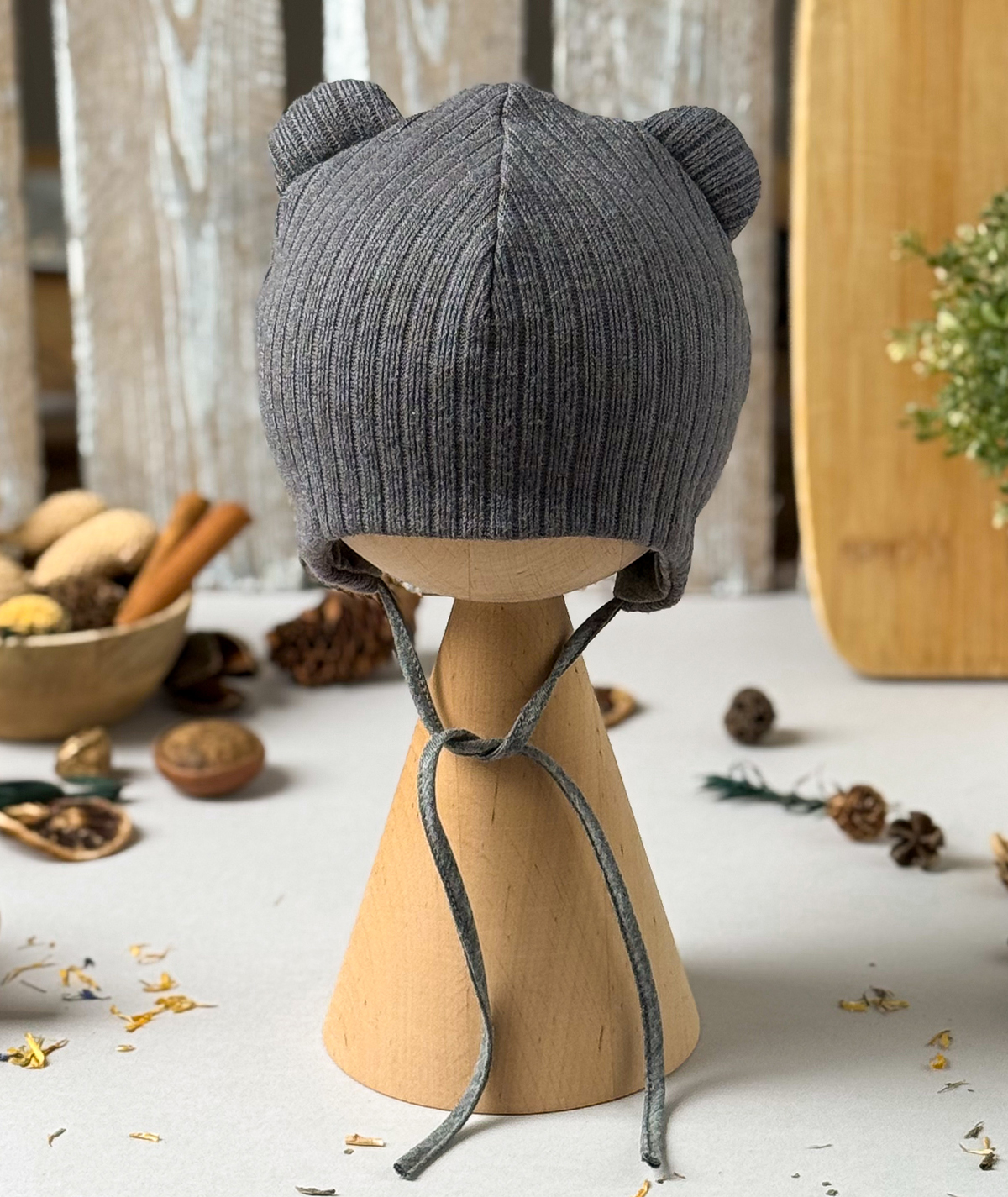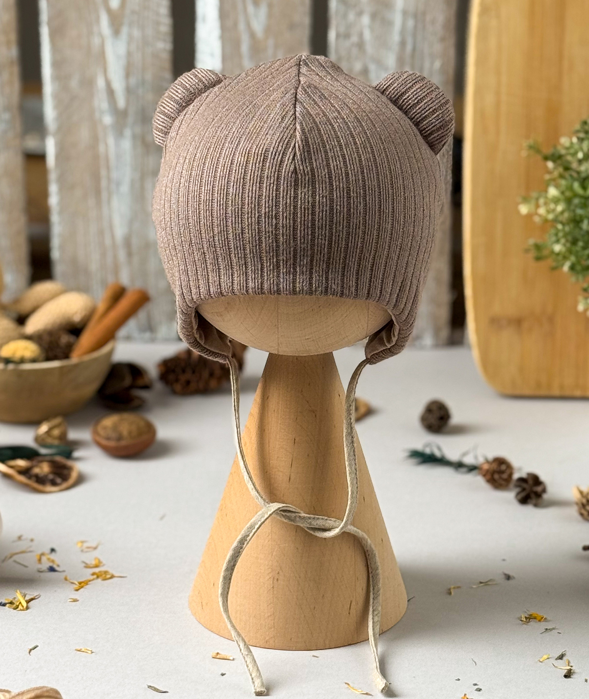 Czapka dla dziecka wiązana z uszami misia – podwójna, ciepła i pełna uroku.