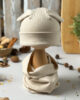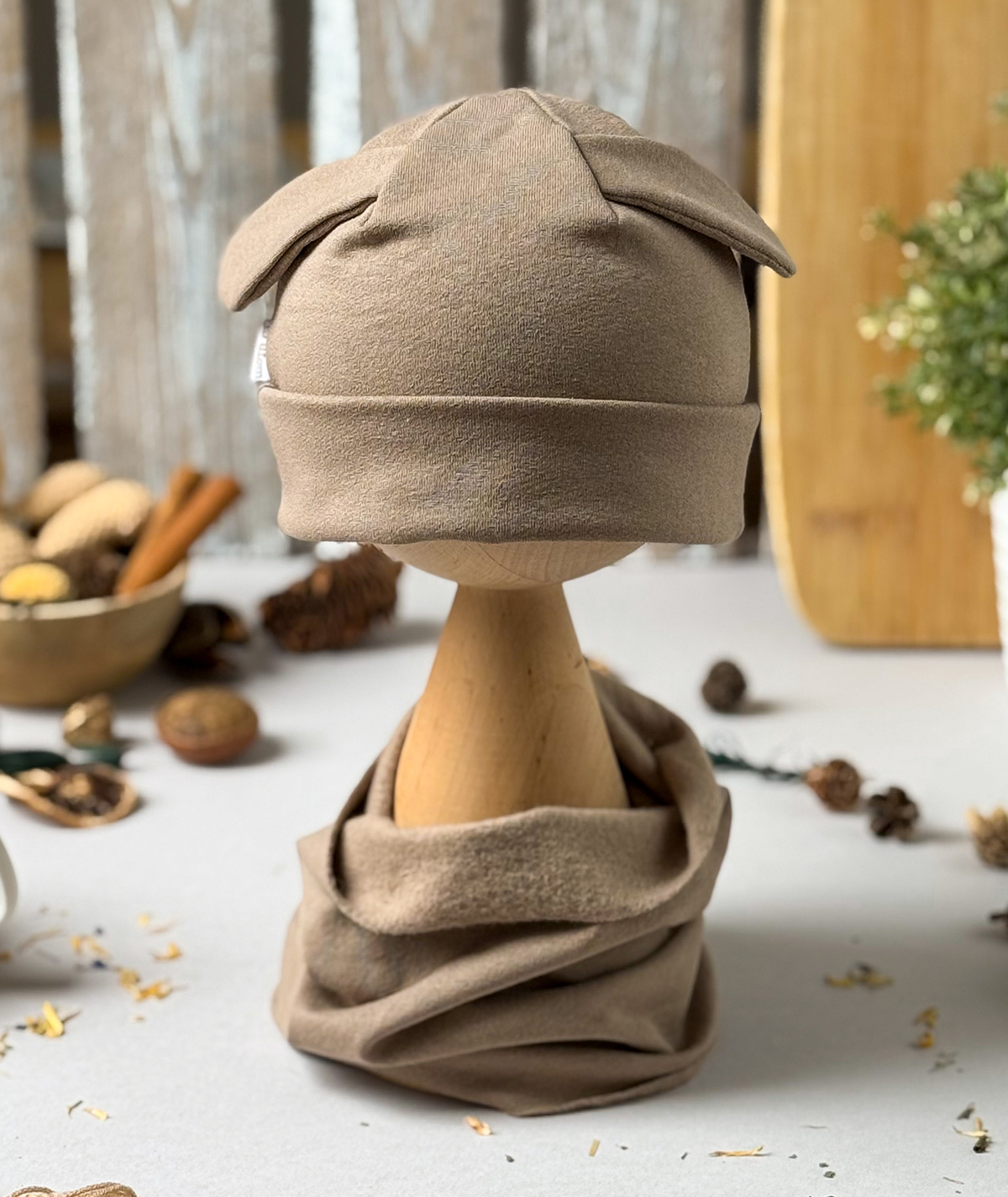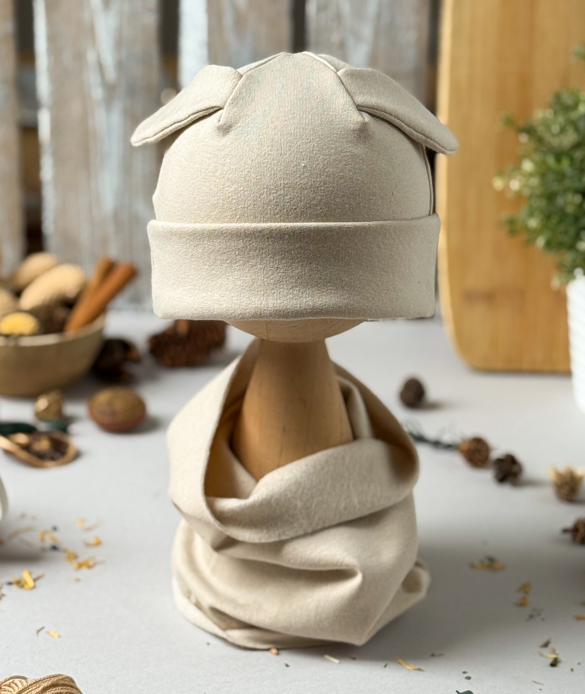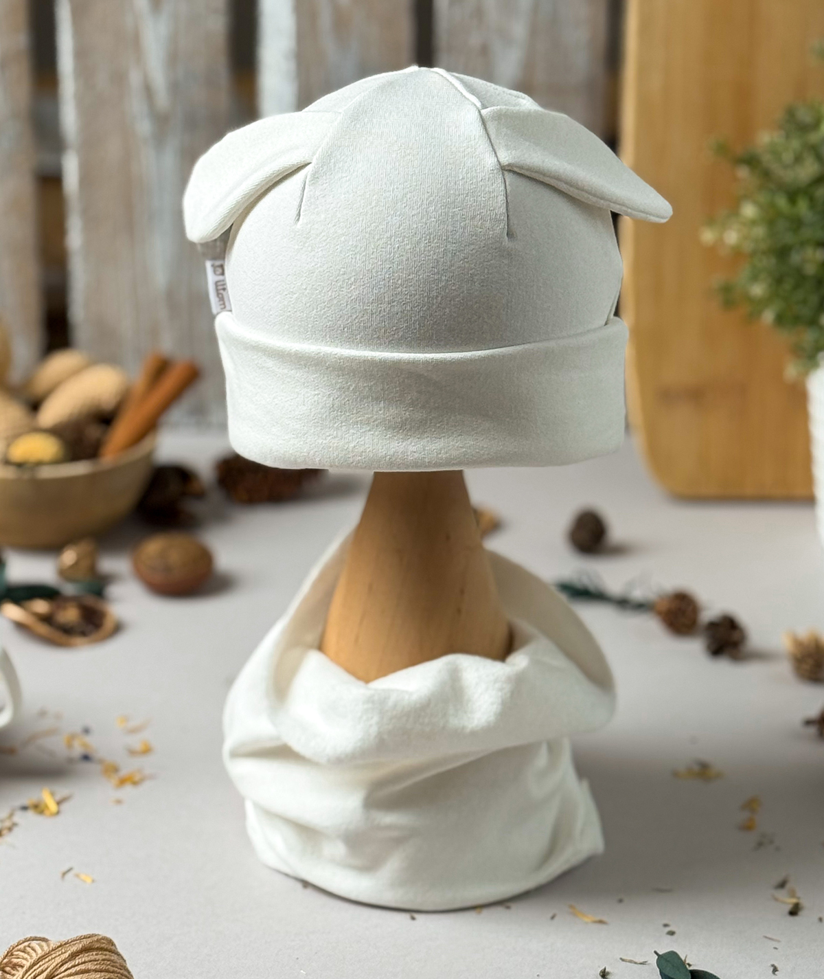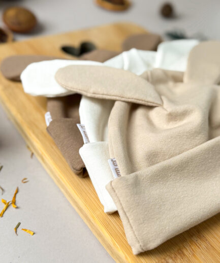 Czapka z uroczymi, ozdobnymi uszkami króliczka i komin z miękkiej, elastycznej dzianiny typu dresówka – wykonany z wysokogatunkowej bawełny, zapewnia komfort i ciepło w chłodniejsze dni, idealnie dopasowuje się do główki i szyi dziecka, nie uciska, a jednocześnie skutecznie chroni przed wiatrem; dostępny w trzech modnych kolorach, świetnie sprawdzi się zarówno na spacer, jak i do przedszkola.