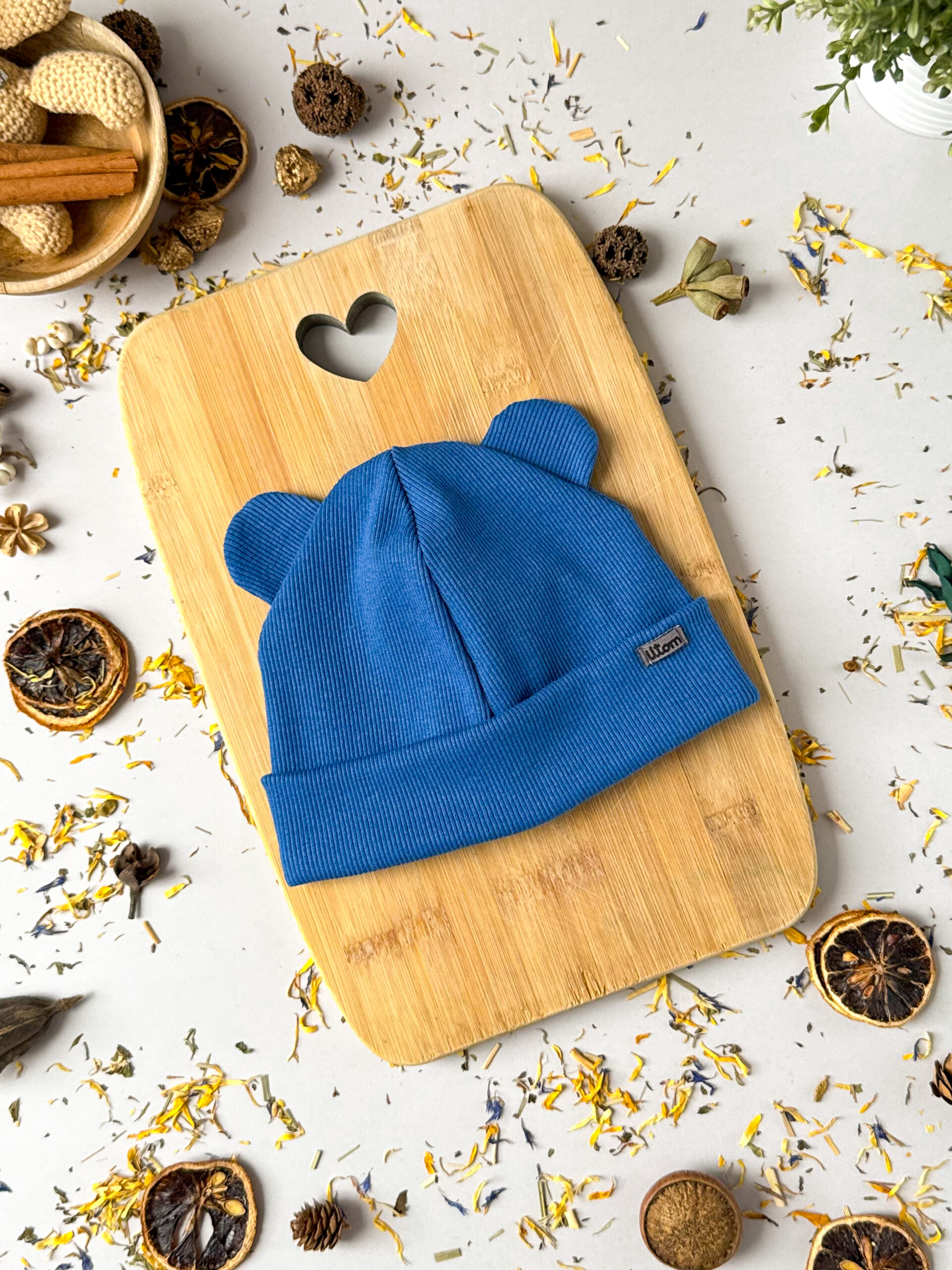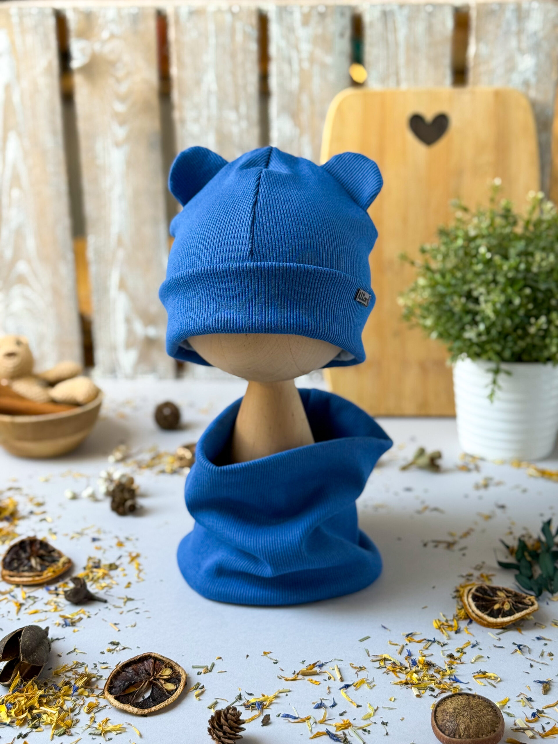 Komplet dla dziecka, czapka, komin/szal. Produkty wykonane z prążka od Polskiego producenta, o wysokiej gramaturze, bawełniany. Czapka z wywinięciem oraz ozdobnymi uszami w kształcie misia. Do kompletu komin z drobną aplikacją z logo marki.