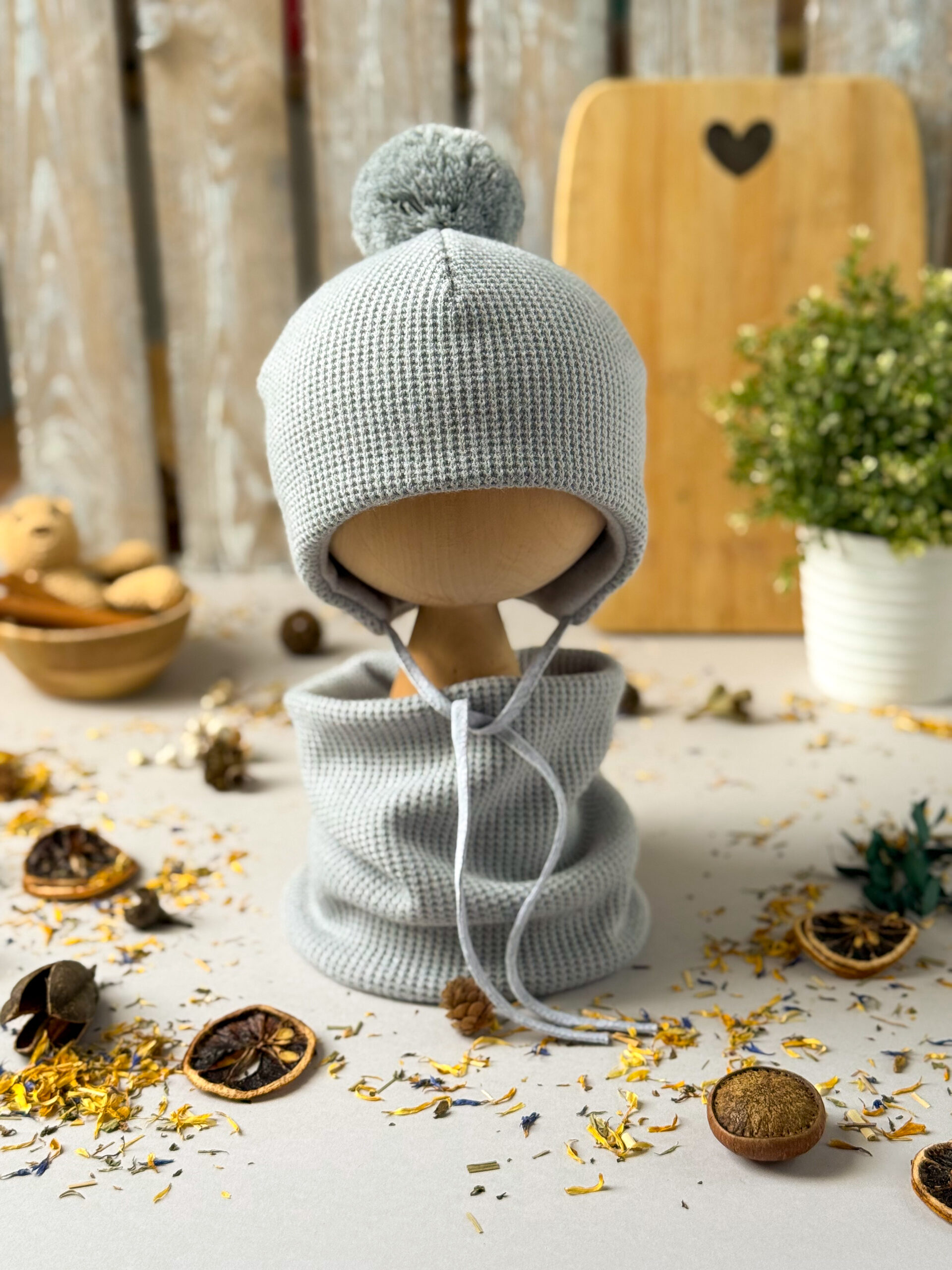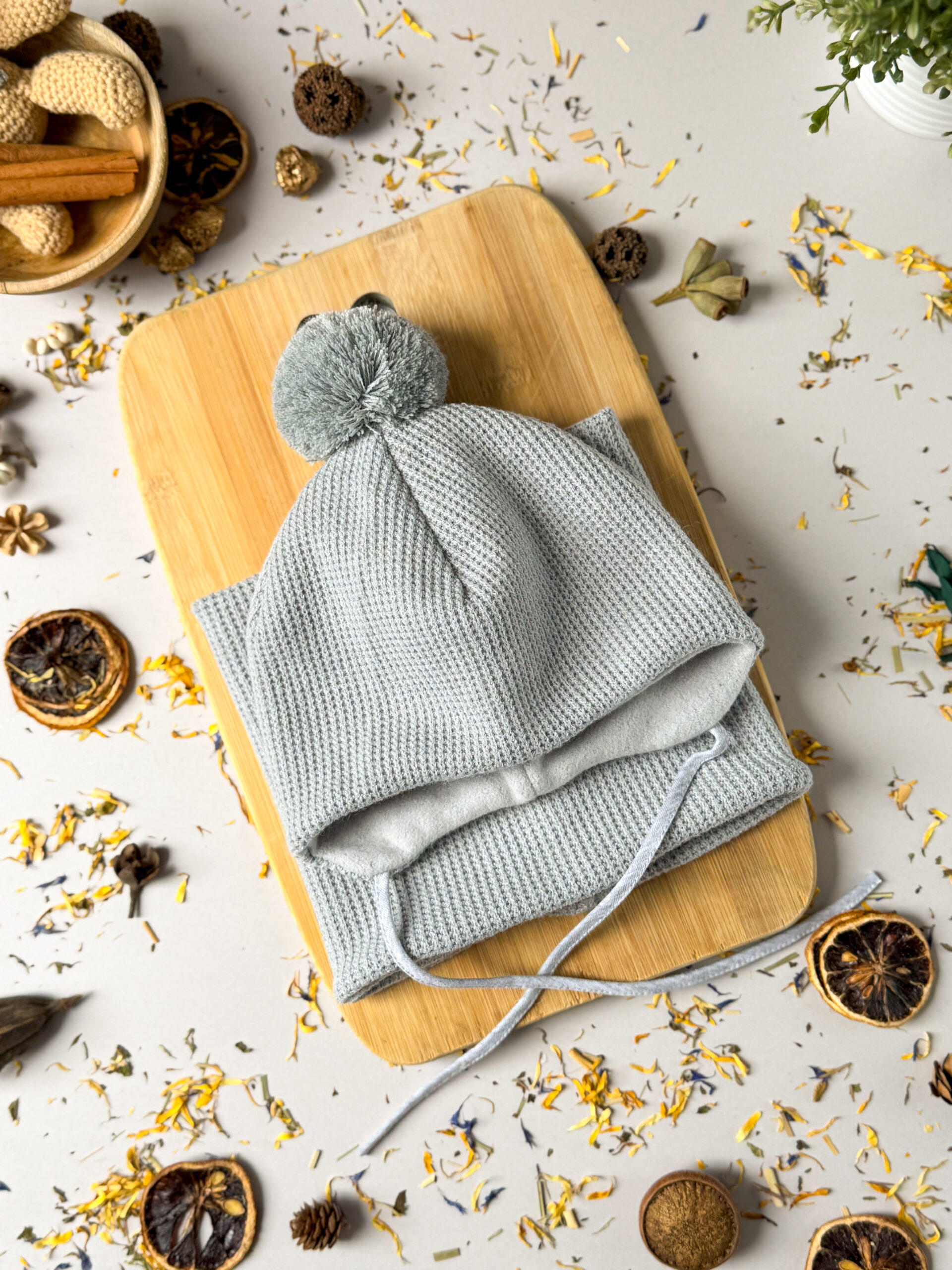 Komplet dla dziecka, zimowy. Komplet składa się z czapki wiązanej z okrągłym, akrylowym pomponem, od środka wykończona miękką dzianiną bawełnianą oraz komina/szala. Produkt certyfikowany „Bezpieczny dla dziecka”. *W rozmiarze 50 i 52 nie występuje wiązanie.